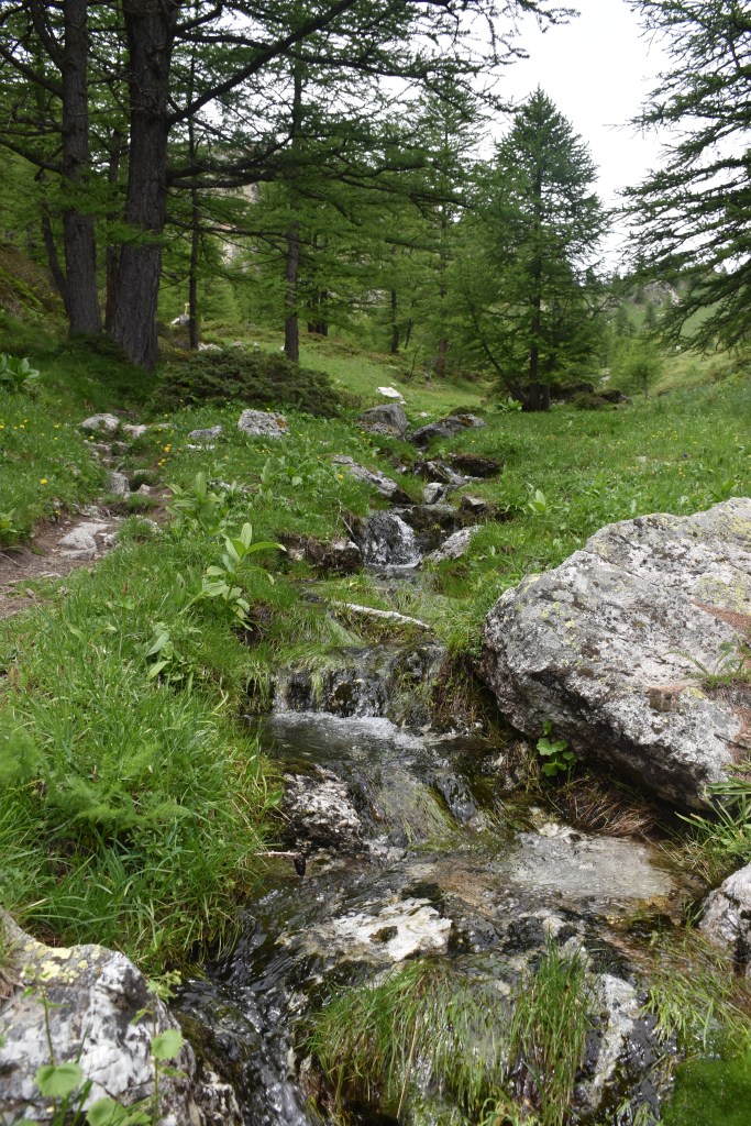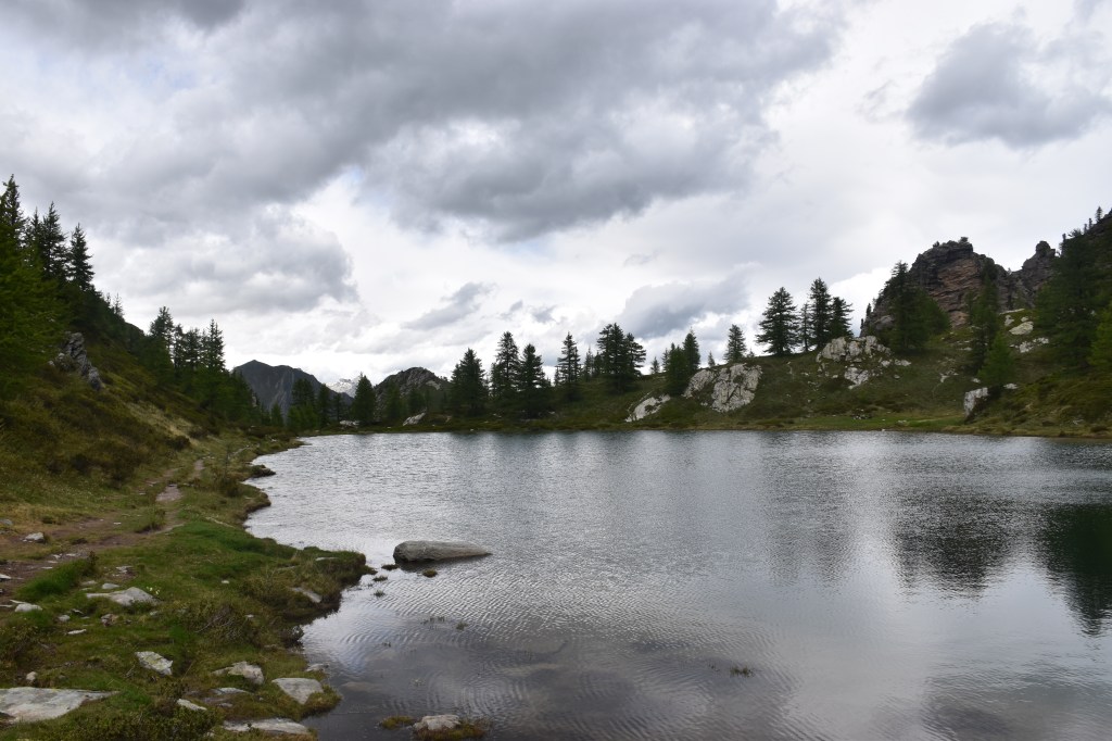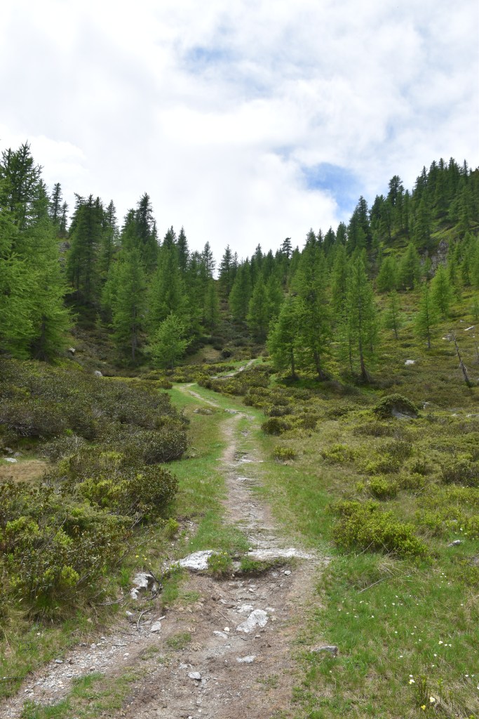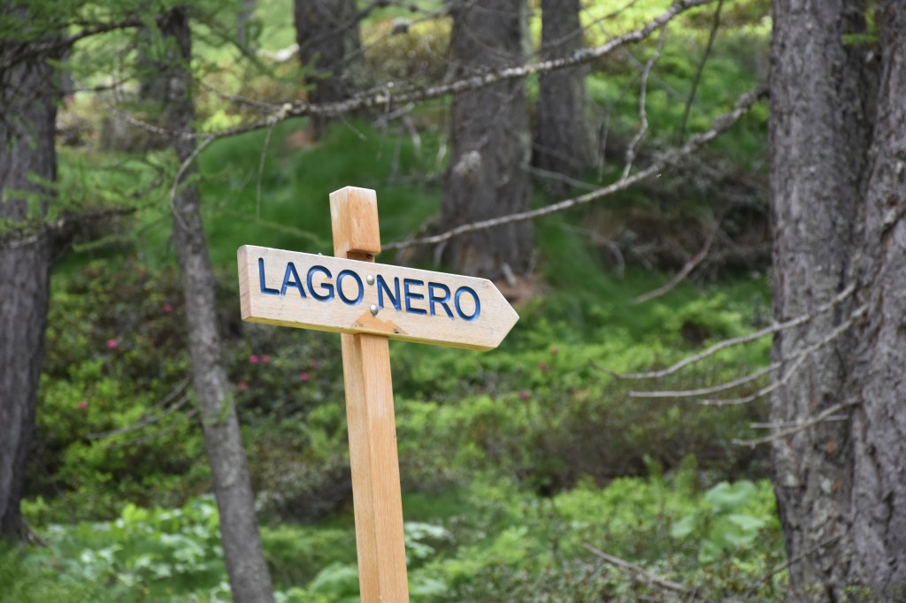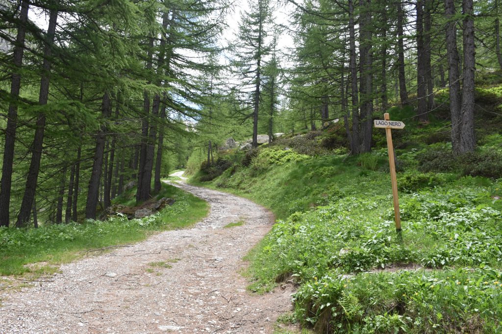 La strada continua a salire dolcemente fiancheggiata da un piccolo torrente, per poi iniziare a salire con pendenze un po’ più impegnative che con qualche tornante vi faranno prendere subito quota. Dopo circa 40 minuti di camminata, finiti i tornanti, si arriva ad un incrocio dove parte un sentiero sulla destra. Seguendo le indicazioni per “Lago Nero” iniziamo a salire lungo il sentiero, fiancheggiando un piccolo ruscello.