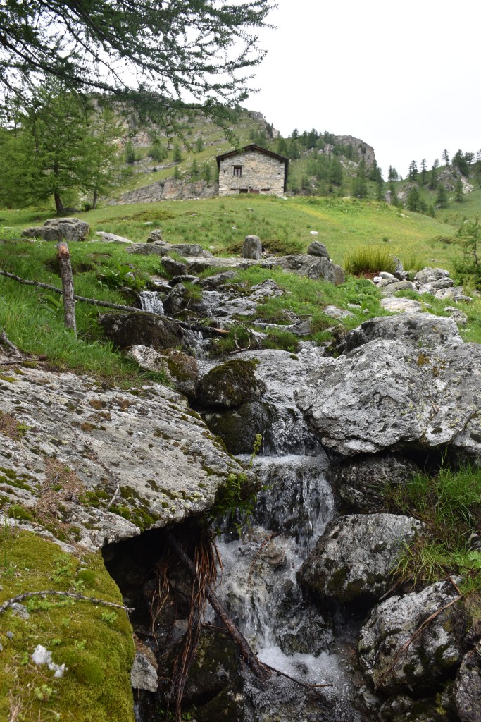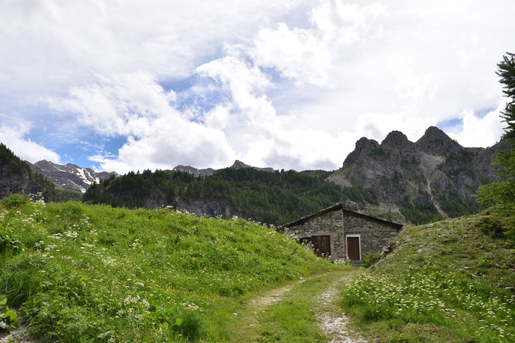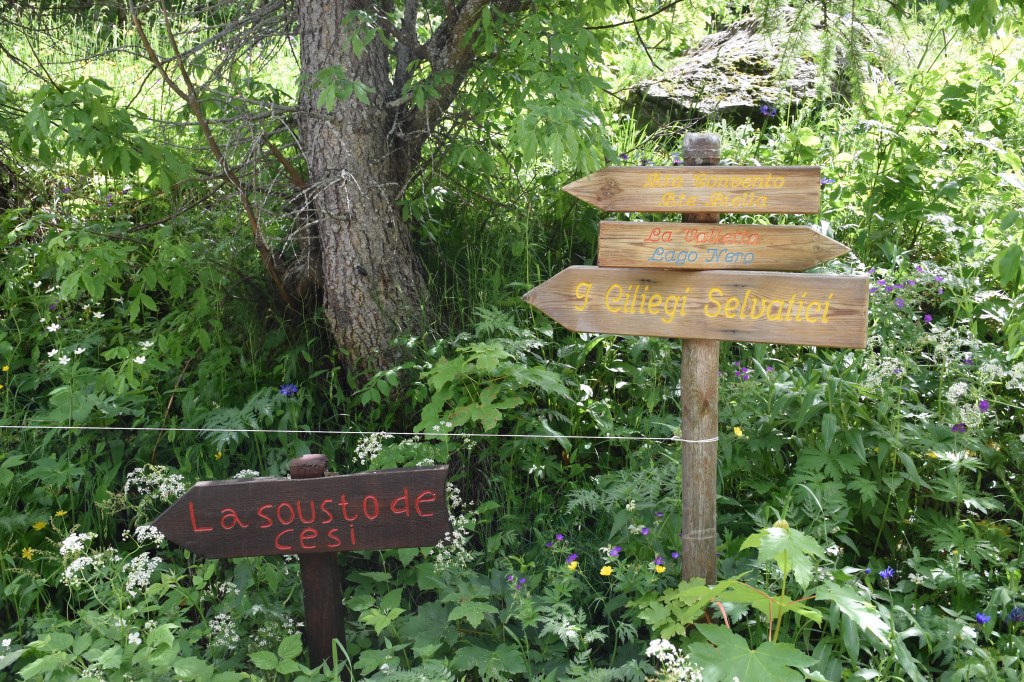 Si cammina per circa 15 minuti lungo la strada, fino ad arrivare alla “Grange Colombero”, una bellissima borgata in pietra immerse nel verde. Di qui si prosegue sempre lungo la strada che si apre tra i pascoli verdi. In 10 minuti si arriva ad un incrocio dove: sulla sinistra la strada porta a due baite e a dei ciliegi selvatici; mentre sulla destra si prosegue per “Lago Nero”, la nostra meta della giornata.