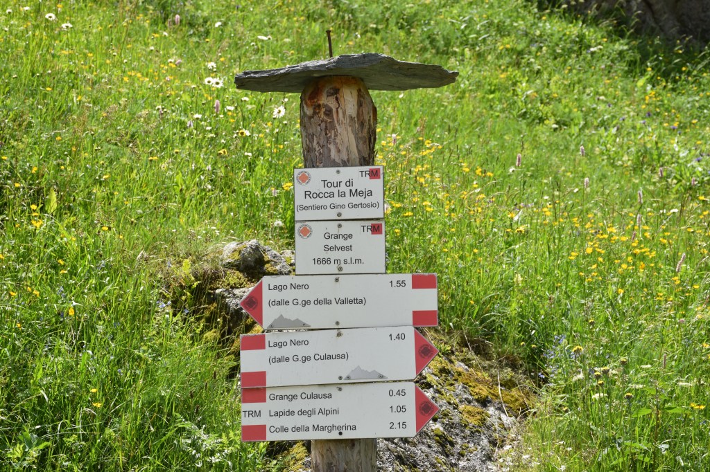 Seguendo le indicazioni “Sentiero” si inizia a scendere. Dopo pochi minuti, la discesa si fa sempre più ripida e con numerosi tornanti si perde quota abbastanza velocemente. Dopo circa 30 minuti di discesa si arriva in un ampio prato verde, dove c’è un incrocio. Ignorando il sentiero sulla sinistra, si prosegue dritti continuando a scendere con pendenze più morbide; fino ad arrivare in 15 minuti al “Grange Culausa”.